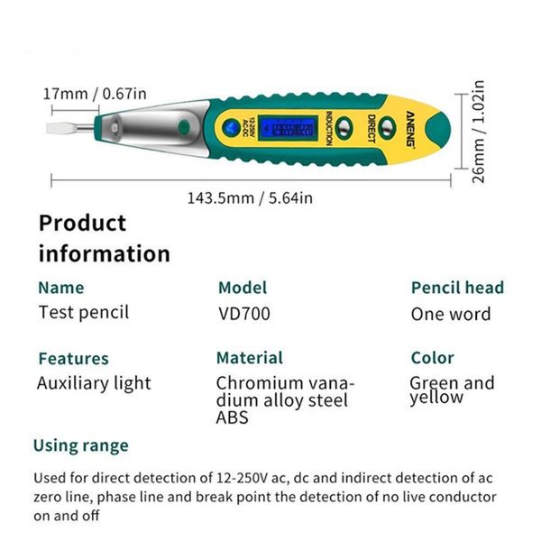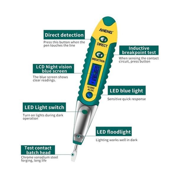 ●6. Scope of application: suitable for detecting 12-250V AC and DC current and simply detecting 0 line, phase line and break point of ac current, as well as non-live conductor and on-off.